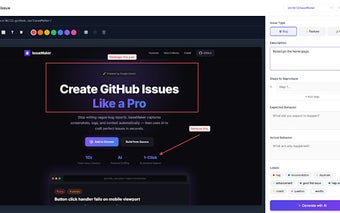 IssueMaker is a Chrome extension designed for effortless GitHub issue creation. It leverages AI technology to draft well-structured issues quickly and efficiently. The tool captures screenshots, logs, and context automatically, allowing users to focus on reporting rather than formatting. Key features include one-click screenshot capture, powerful annotation tools, and the ability to generate issues with proper formatting and steps to reproduce.